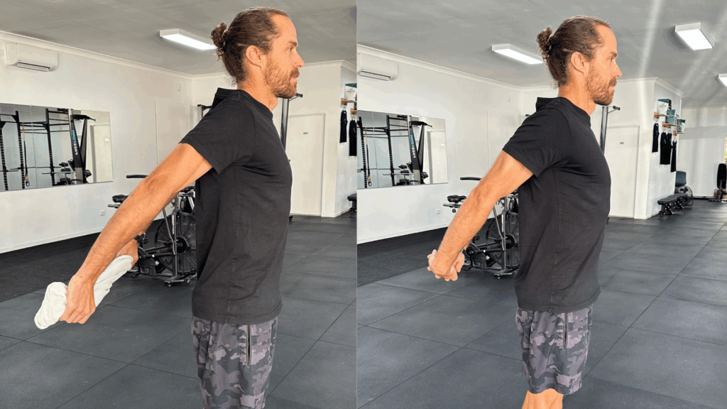 • Clasp your hands behind your back (use a towel if your hands don’t quite meet).
