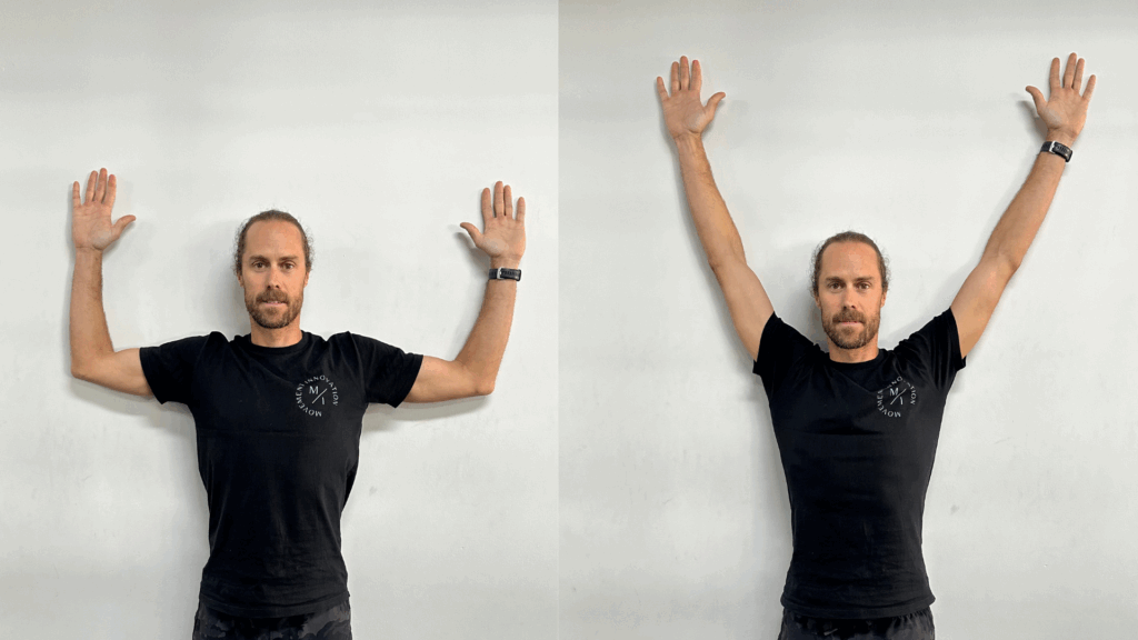 • Raise your arms up into a ‘goalpost’ shape, elbows bent at 90 degrees, with the backs of your hands touching the wall.