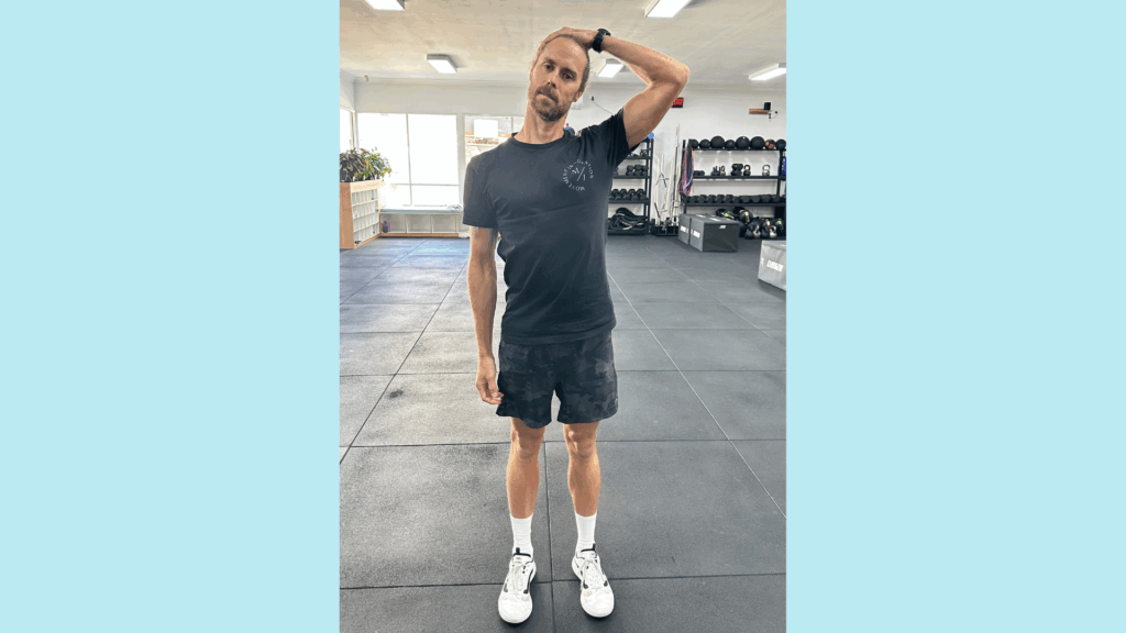 • You can deepen the stretch slightly by using your hand to apply light pressure on your head.