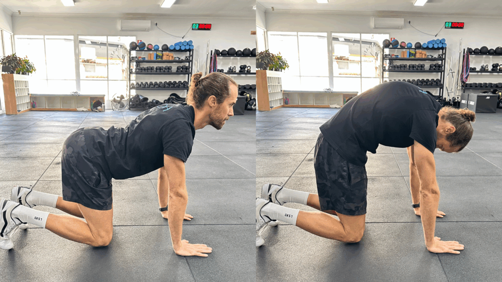 • Start on all fours, with your hands under your shoulders and knees under your hips.
